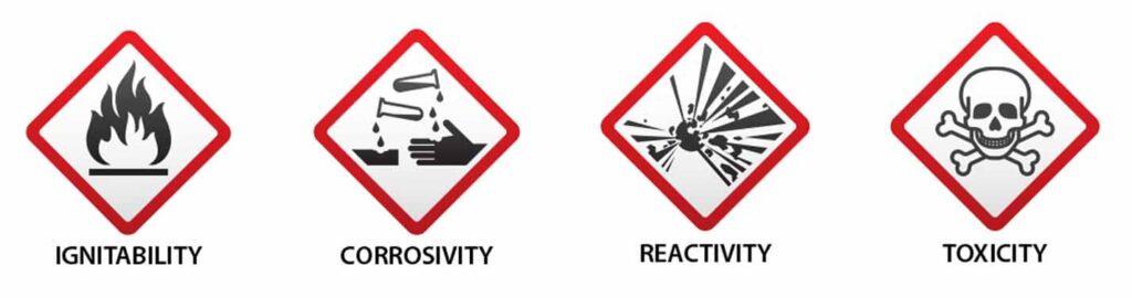 A hazardous chemical is a solid, liquid, or gaseous material that displays either a “Hazardous Characteristic” or is specifically “listed” by name as a hazardous or has characteristics of hazard. These four characteristics are Ignitability, Corrosivity, Reactivity, and Toxicity.